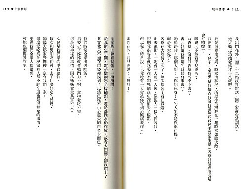 電車男大概是天才吧。不過他的天才在我們家,最大功能是應付老媽。……我跟他的溝通已經到達我只要說「阿阿呃呃耶耶」就可以搞定一切的境界。P197
