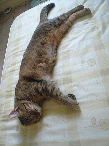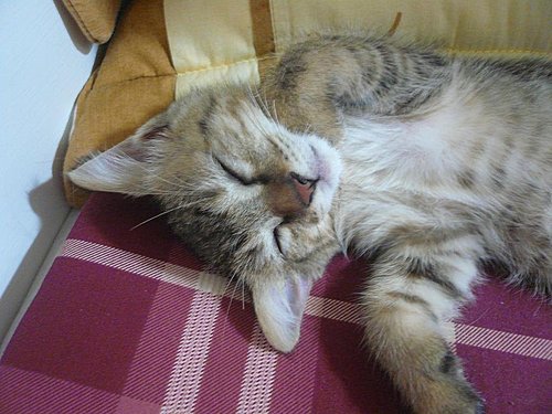 帶著維多利亞頭套的美滿睡覺時似乎沒有受到任何影響 貓咪毛茸茸的睡在毛毯上感覺睡的非常香甜 其實平常美滿都睡長方形的我們給她取了個綽號和運動牌子的豹很像,別名 PUMA 這張是美滿剛到家裡的照片看得出來毛還沒長齊實在可愛到讓人不疼也難