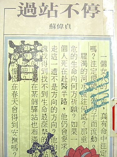 先文在台北下車後,處處望去讓人碰壁的高樓收回視線後不再是份厭惡,時間過得真快,她現在知道了,台北人海是這樣的深,她正好可藏身其中。楓港她真心愛,所以回不去了,那裡教她難過。P170